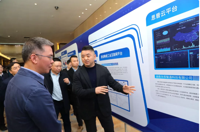 • k8凯发智通总经理傅帝向湖南省工业和信息化厅党组书记、厅长曹慧泉介绍思普云在工业领域应用情况